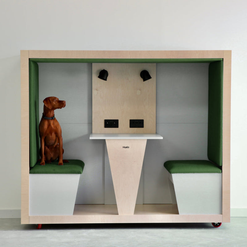 A semi-open pod for 2 people. It's on wheels and can move in an instant. Ideal for 1-1s and great at breaking up open plan spaces.