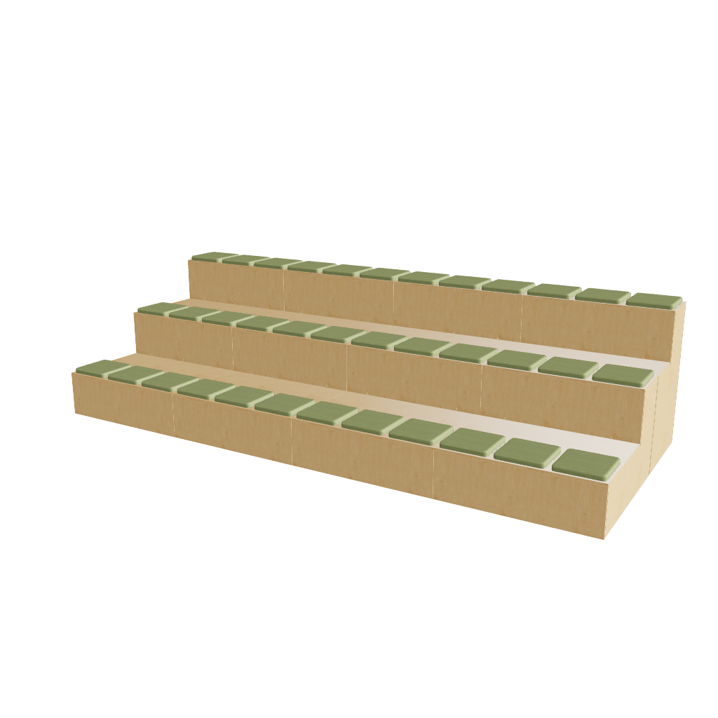 This example assembly uses our Basecamp TS01 and TS04 units to generate height and depth. The bleachers seating has seating pads over 3 tiers and room to accomodate the users feet. Available in a range of panels finishes and any colour upholstery. Barriers and steps available as requested.
