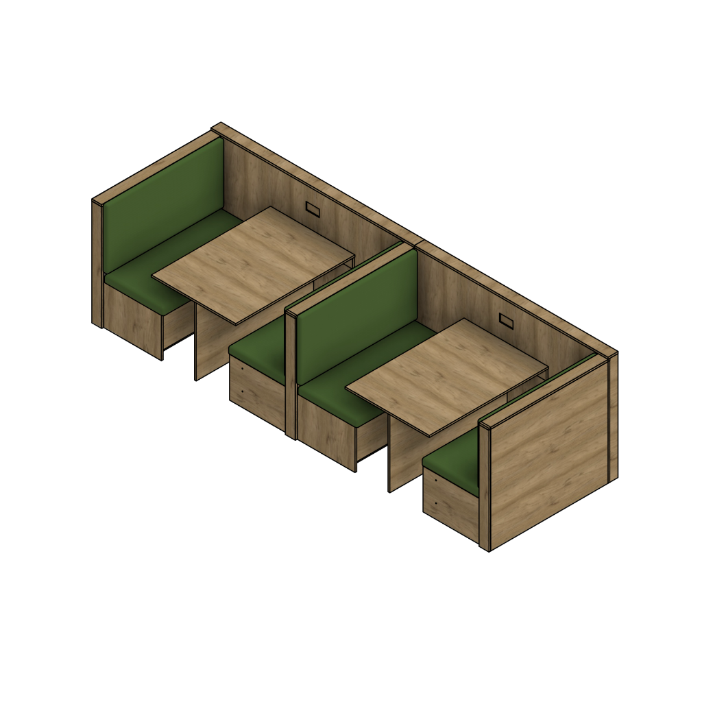 Koppi 2 is a row of two booths that seats a total of 8 people. It features fully upholstered seat and back pads in a huge range of fabrics. Internal cable routing for power maintains a clean appearance.
