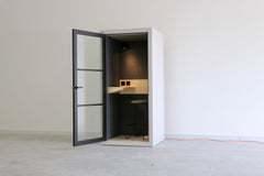 Double-lined walls with dense acoustic insulation reduces external noise, while the interior is wrapped in soft felt for a warm, quiet atmosphere. A built-in real wood veneer desk adds a natural touch, complemented by a power outlet, LED lighting and ventilation.