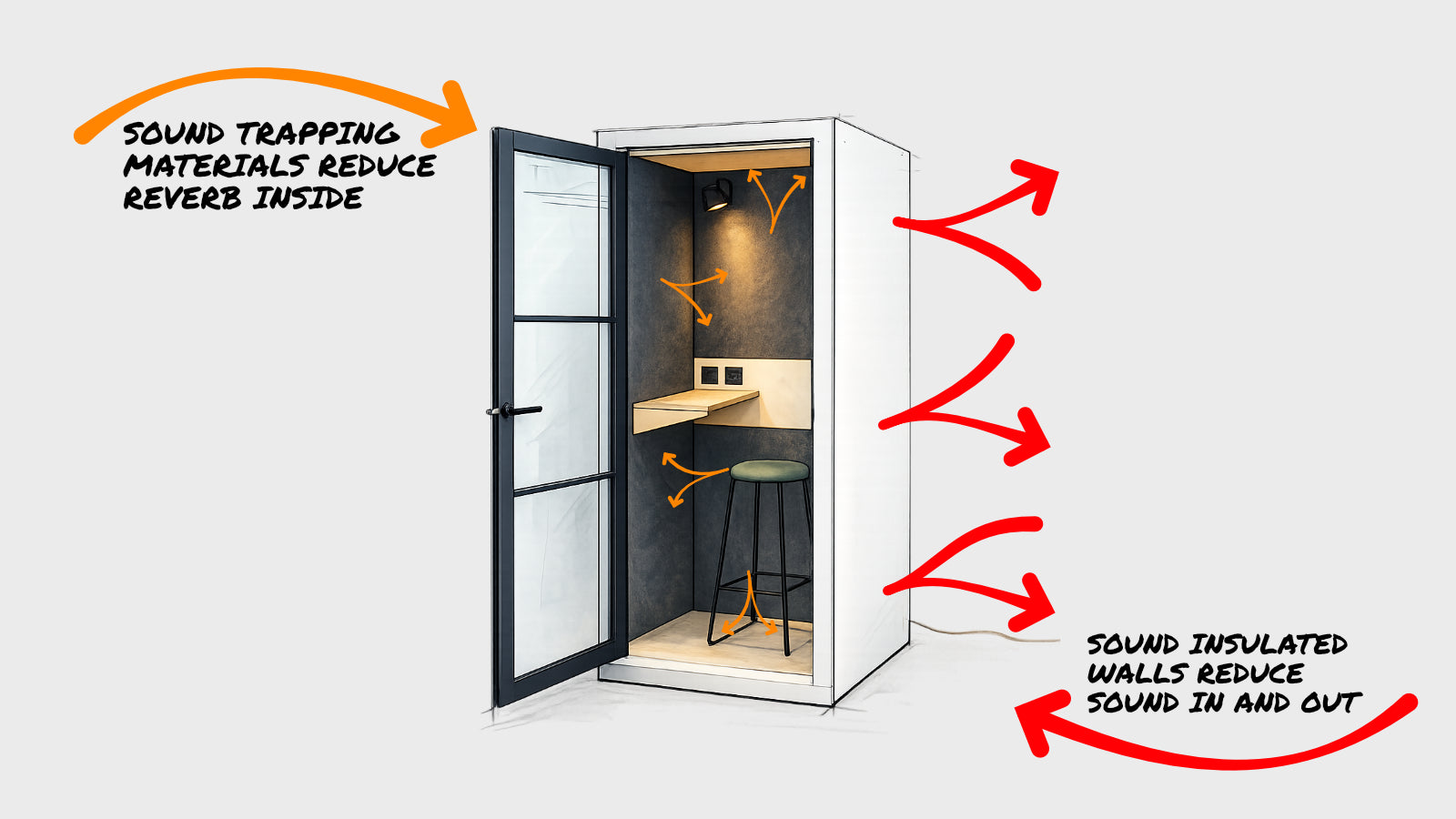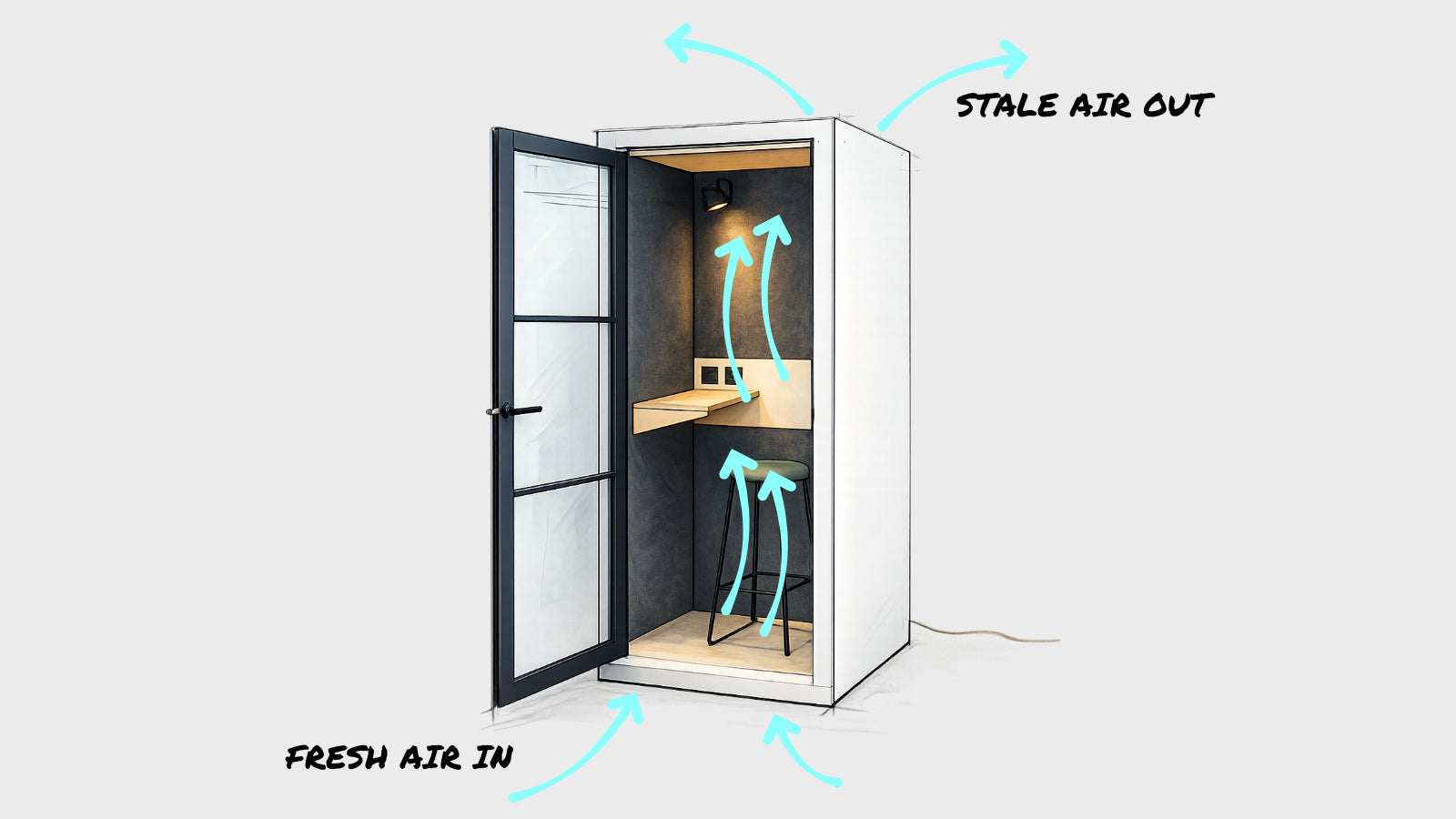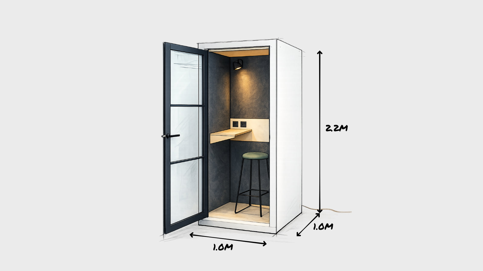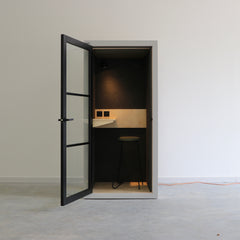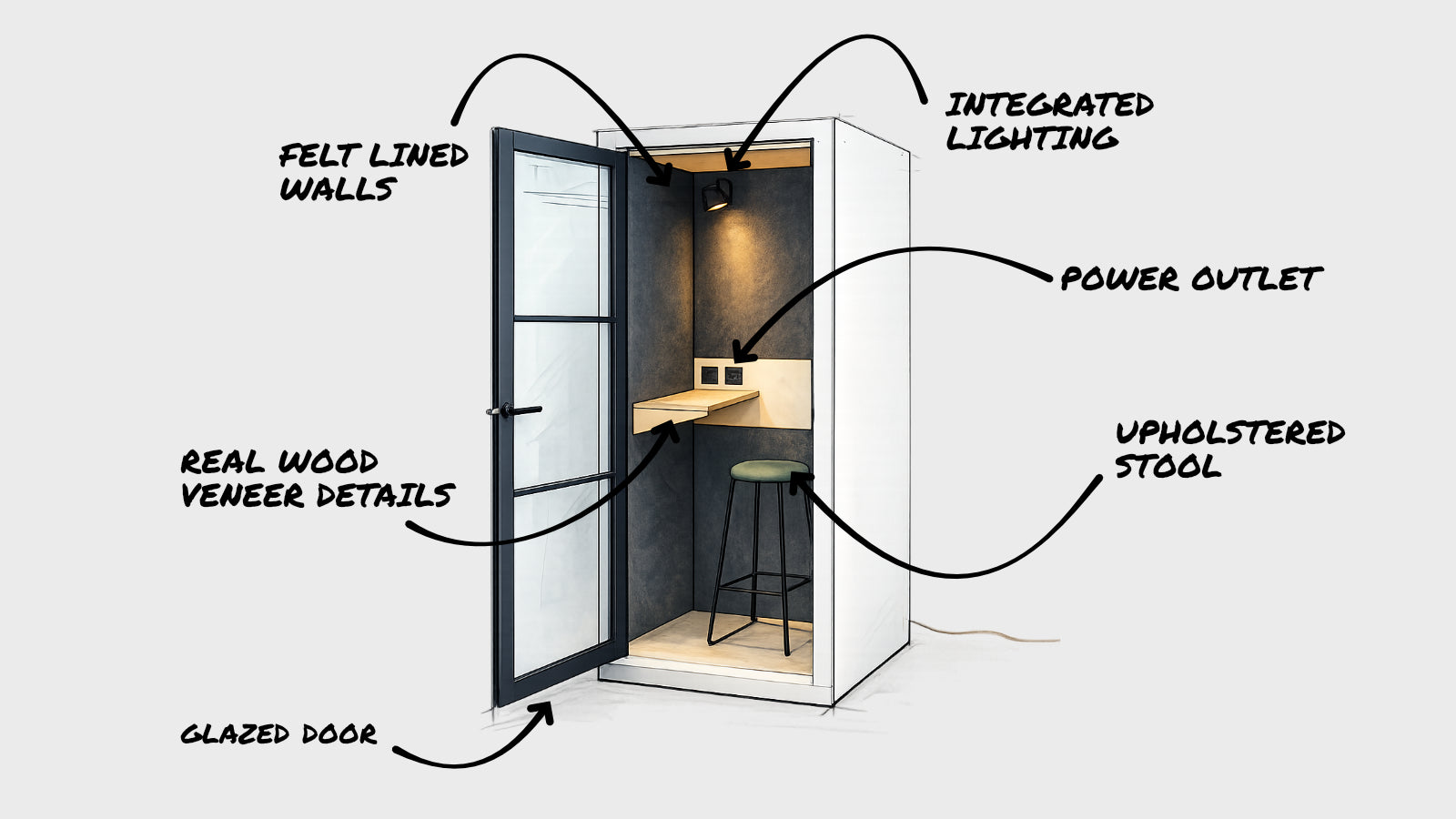 Stuga is our single-person phonebox booth designed for modern workplaces. Built with performance and simplicity in mind, it offers a calm, private space for calls, video meetings or focused work.